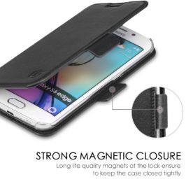 • An electronics-safe magnetic strip in this galaxy S6 Edge folio case holds the front cover shut when not in use. You know your items are held in place and exactly where you left them. Even if your S6 Edge card case takes a tumble, your phone, cash, and cards, will be securely held in place